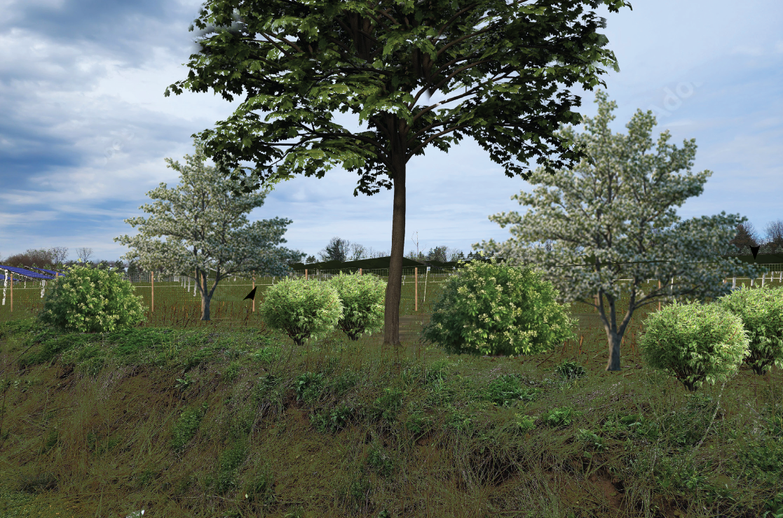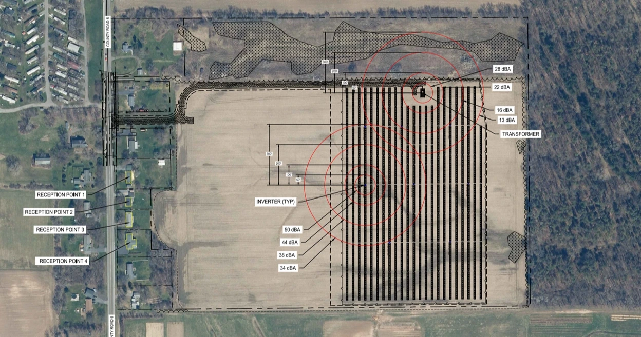 As exhibited in the Project Site Plans, the Project proposes vegetative screening along the western edge of the solar array, which will further dampen (reduce) the project's acoustics from neighboring properties, beyond the results of the study. Given the distance of equipment from reception points (residences) and the proposed vegetative buffers, acoustic impacts to neighboring properties are non-significant, and no further analysis is required.